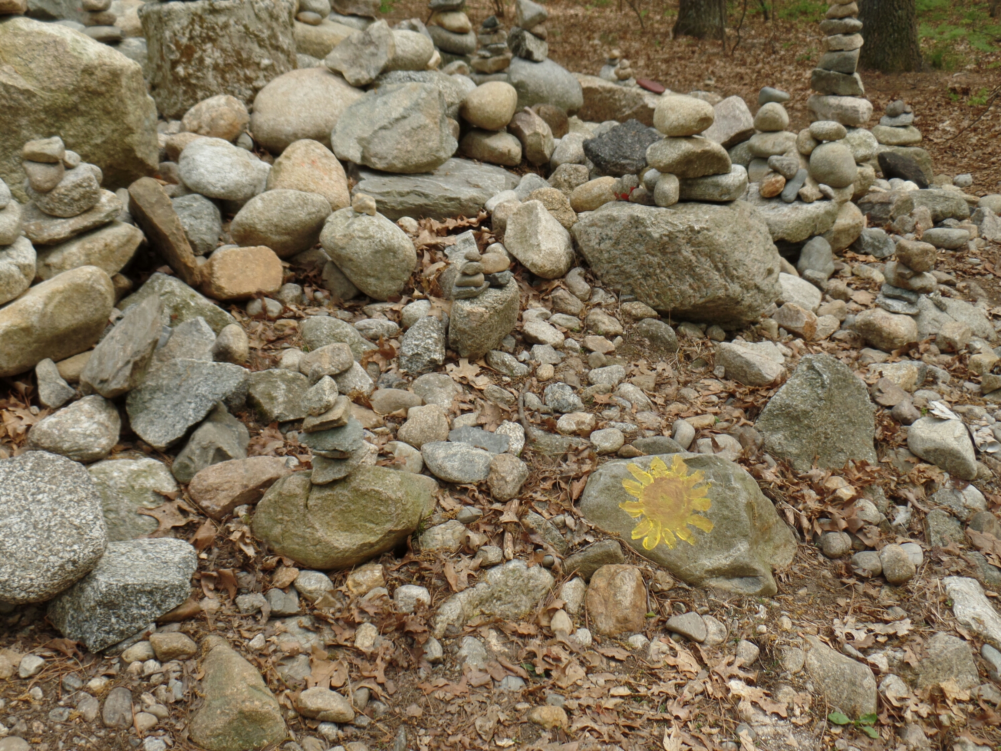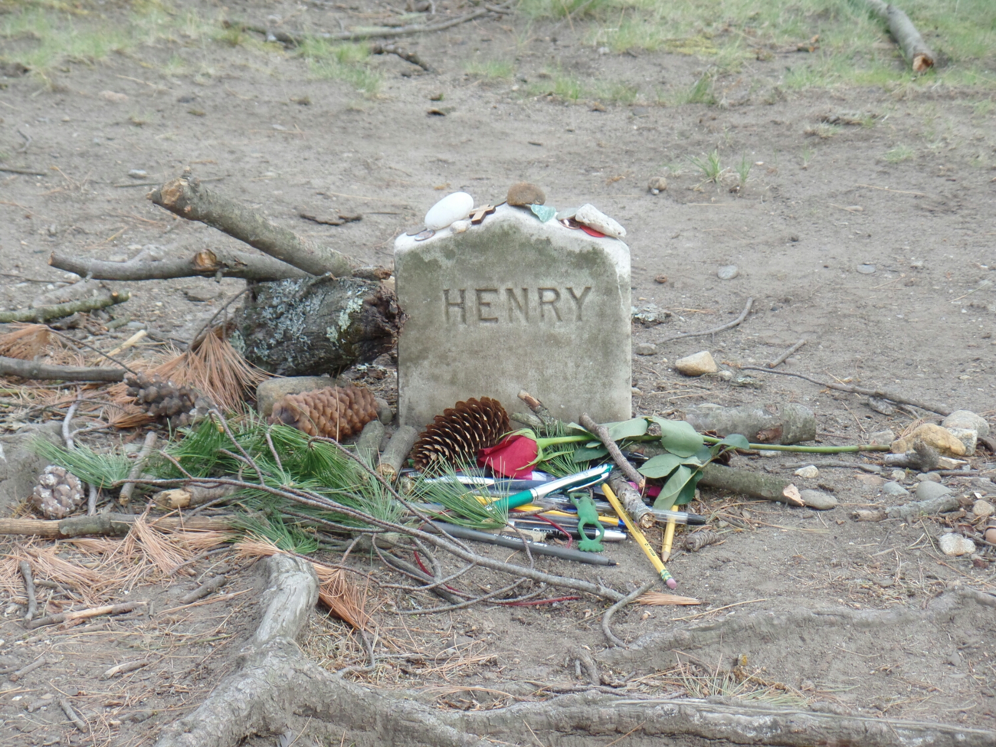Thoreau’s house on Walden Pond no longer exists. He only lived in it for two years as an experiment. When he moved out, the house was moved and used for grain storage for a while before being broken up for scrap lumber. The roof was put on a pigsty. In 1872, a friend of Thoreau’s took a visitor to Walden Pond and they put stones where the friend thought the house once stood. Since then, visitors have put their own stones as a tribute to Thoreau and a very large pile of stones has arisen. I added my own small stone to the pile.