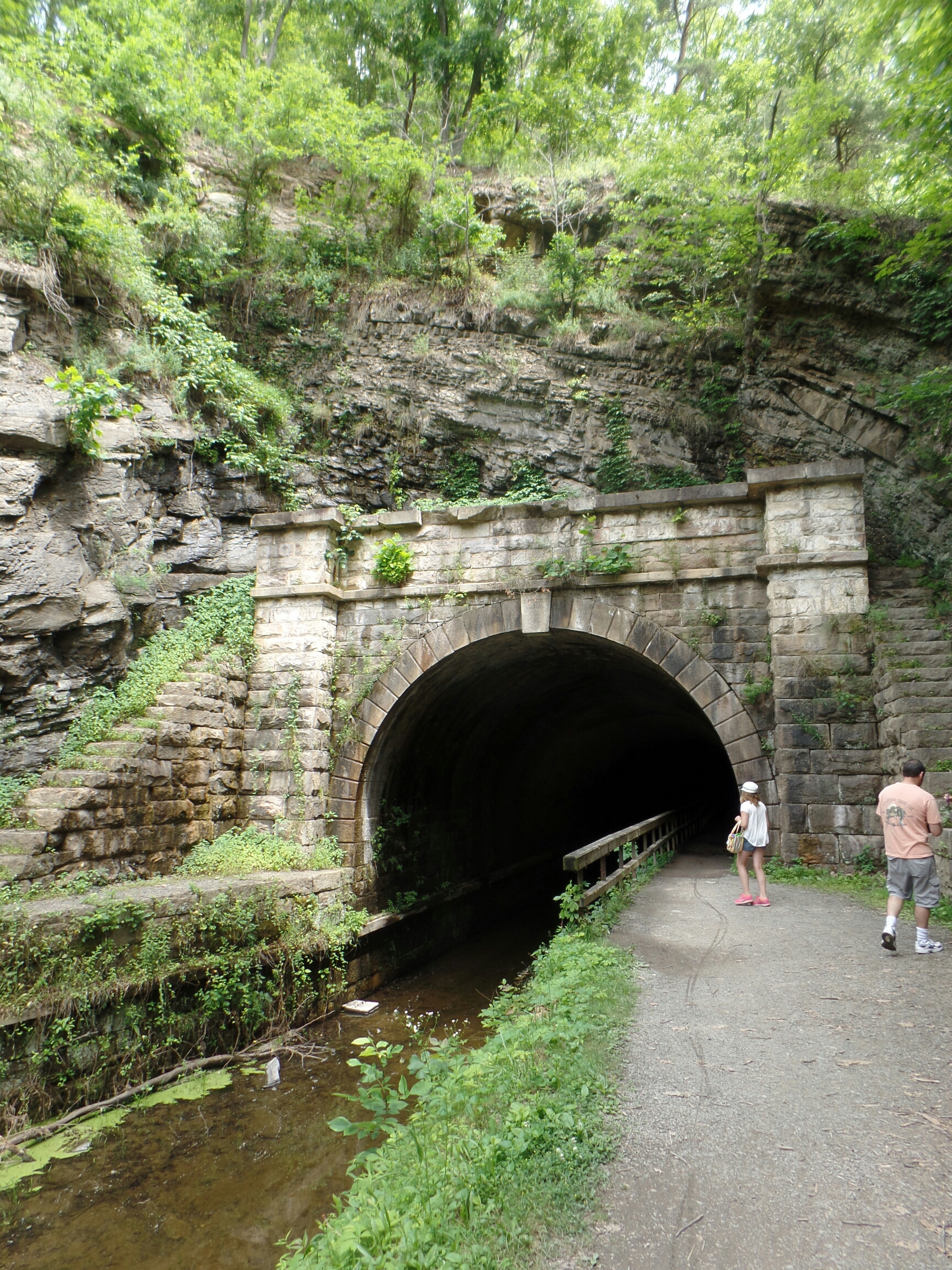 Today’s route took me through the Paw Paw Tunnel. The Paw Paw Tunnel is a little more than half a mile long. The towpath through the tunnel in narrow with a rough surface, a wall on one side and a fall on the other. There is a wood railing to keep people from falling in the canal, but with my weight and the extra weight of the bicycle, I wasn’t sure how much to trust the railing. Most cyclists I saw in the tunnel walked their bikes. I straddled my bike with one foot on the pedal and the other kicking like a skate board. There are no lights in the tunnel. You can see the lights at either end, but the tunnel gets very dark. Even though you can see the other end from when you enter, it never seems to get any closer until you are just about out.