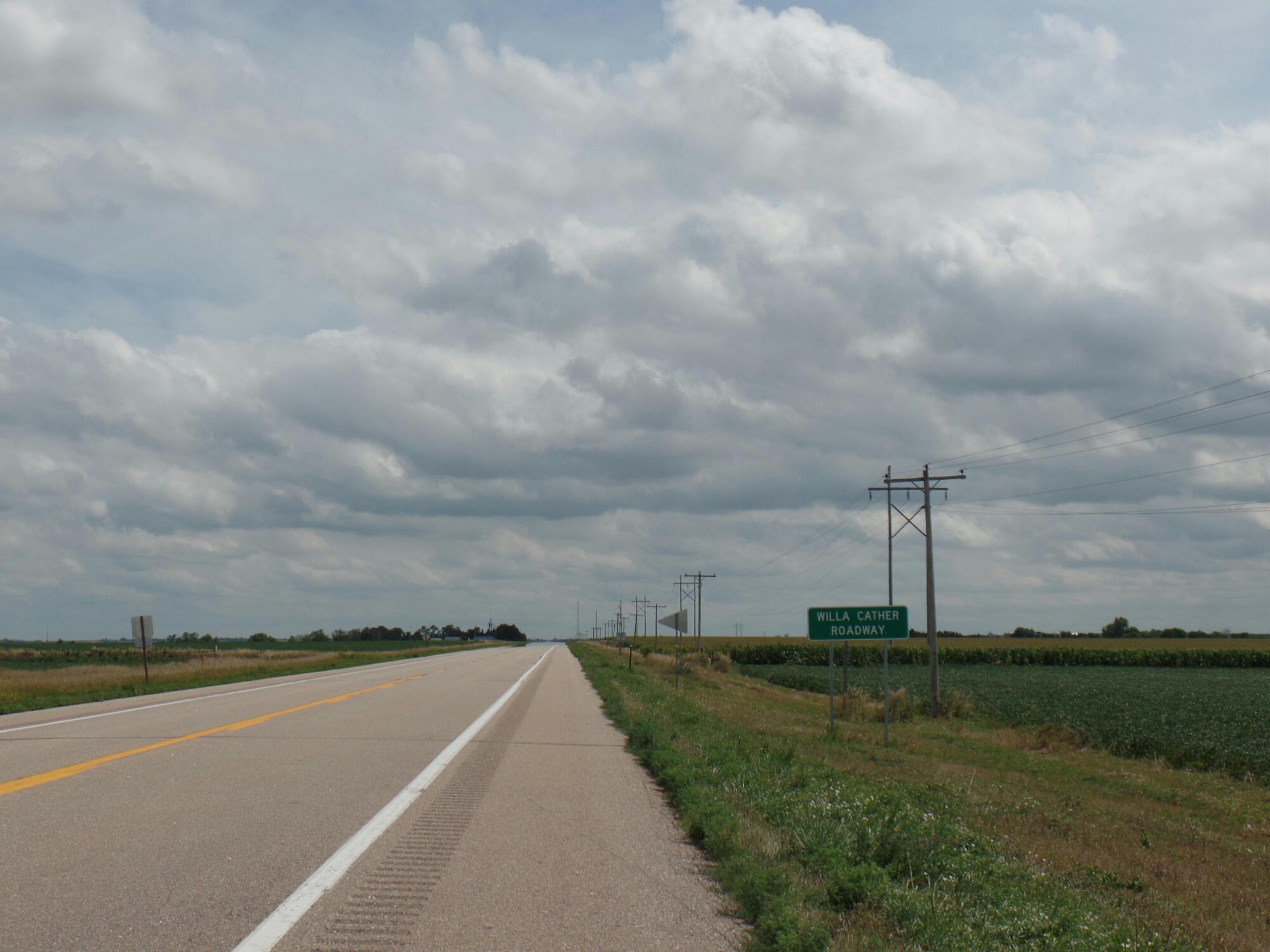 As I rode south toward Red Cloud, NE, the scenery began to change, gradually becoming more like the prairie I remember from my teen years. The corn and soybean fields are slowly giving way to wheat and pastures. The flat Platte Valley is beginning to undulate with the short, steep hills that have been carved into the plains by so many thousands of now dry streams. It is absolutely gorgeous. I am not sure why I like the plains so much; I have never quite been able to put it into words. It really doesn’t lend itself to photographs, but I experimented with the panorama function of my camera in an attempt to try to capture it.