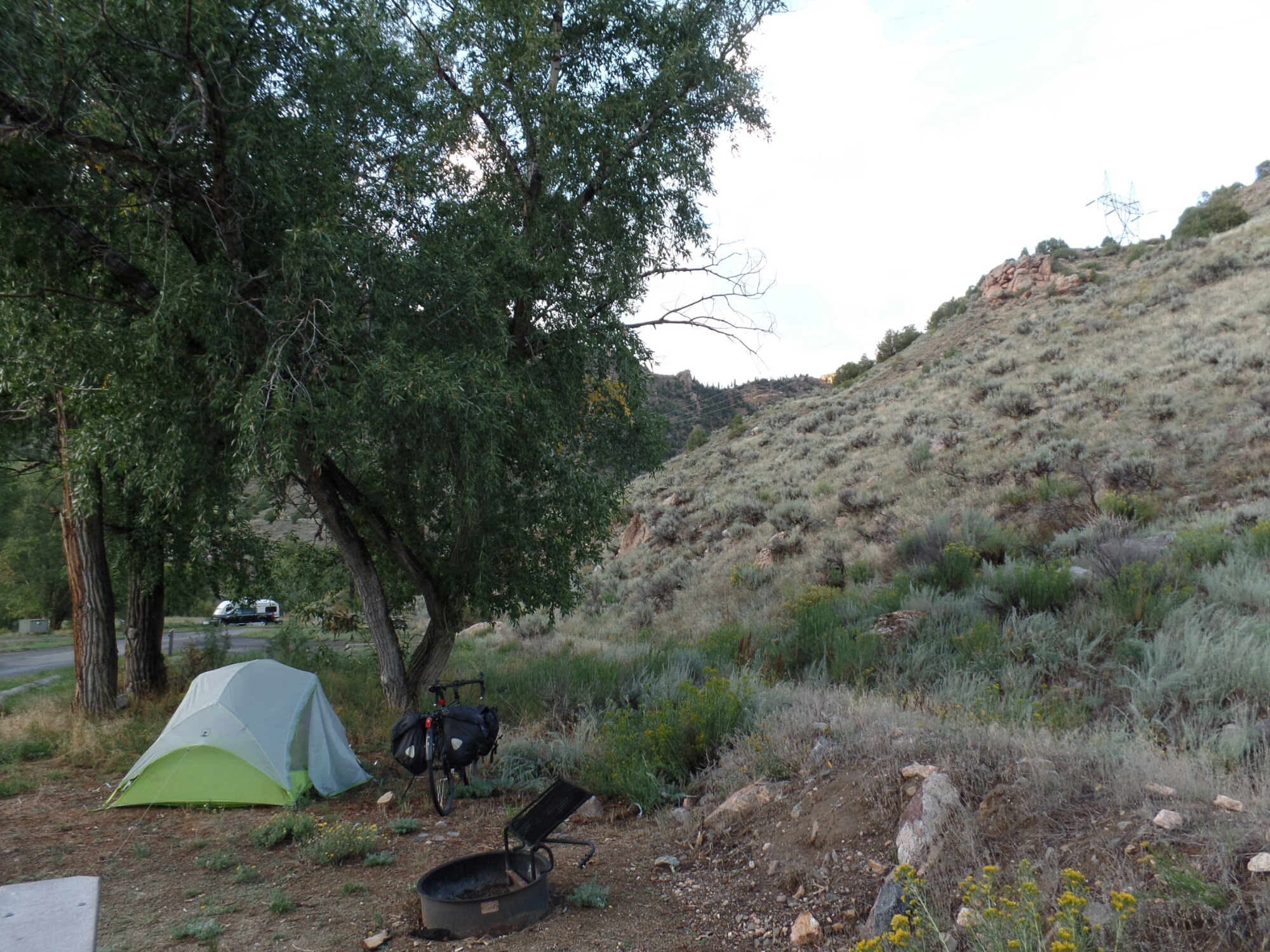 It didn’t take long for the rain to quit. I was pretty cold when the sun came back out. I only rode another few miles to Cimarron, at the bottom of another side canyon. There is a small campground that is first come, first serve. It doesn’t have electrical hookups for RV’s nor showers, so it doesn’t usually fill up. When I got there, there were only about three or four other people there. By the time I went to bed, it was mostly full, but not completely even for a holiday weekend.