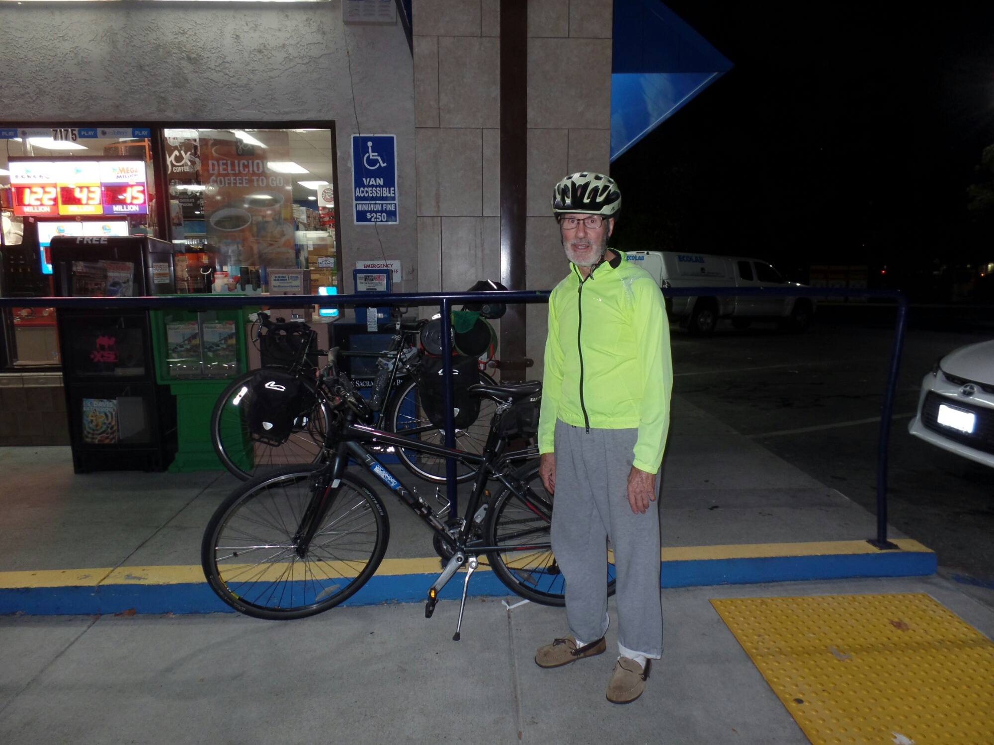 I had planned to stop in Plymouth, CA, and wait out the storm tomorrow. When I reached Plymouth, I was still feeling good and pushed on. Several miles down the road, I stopped for a break and met Lawry, a local cyclist. We chatted for about an hour. By the time we finished talking, it was dark. I have avoided riding in the dark for the most part on this journey. However, tonight I really didn’t have a choice. Fortunately, a few miles down the highway, I turned onto a bicycle path that led me into a suburb of Sacramento.